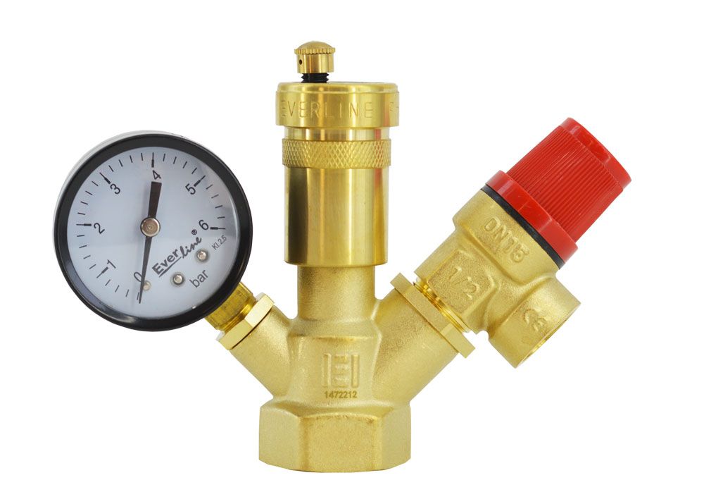 Grup siguranta pentru centrale lemne si termoseminee EverlineGrupul de siguranta pentru centrale lemne si termoseminee Everline este conceput pentru aplicatii in camera tehnica pentru protectia centralei termice sau a termosemineului in cazul functionarii in conditii critice. Manometrul are rolul de a afisa presiunea agentului termic din instalatie. Aerisitorul automat cu plutitor permite evacuarea fara interventie manuala a aerului si gazelor ce se formeaza in instalatie prevenind fenomenele de coroziune, cavitatie sau a dopurilor de aer in instalatie. Concomitent supapa de siguranta mentine sub limita maxima admisa de 3 bar, presiunea agentului termic. In cazul in care presiunea din instalatie depaseste 3 bar, supapa se deschide regland astfel presiunea si protejand instalatia.Compus din:- corp racordare din alama , racord FI 1″”- manometru 6 bar, racord 1/4″”- supapa aerisire automata 3/8″”- supapa siguranta cu membrana 3 bar, ½””