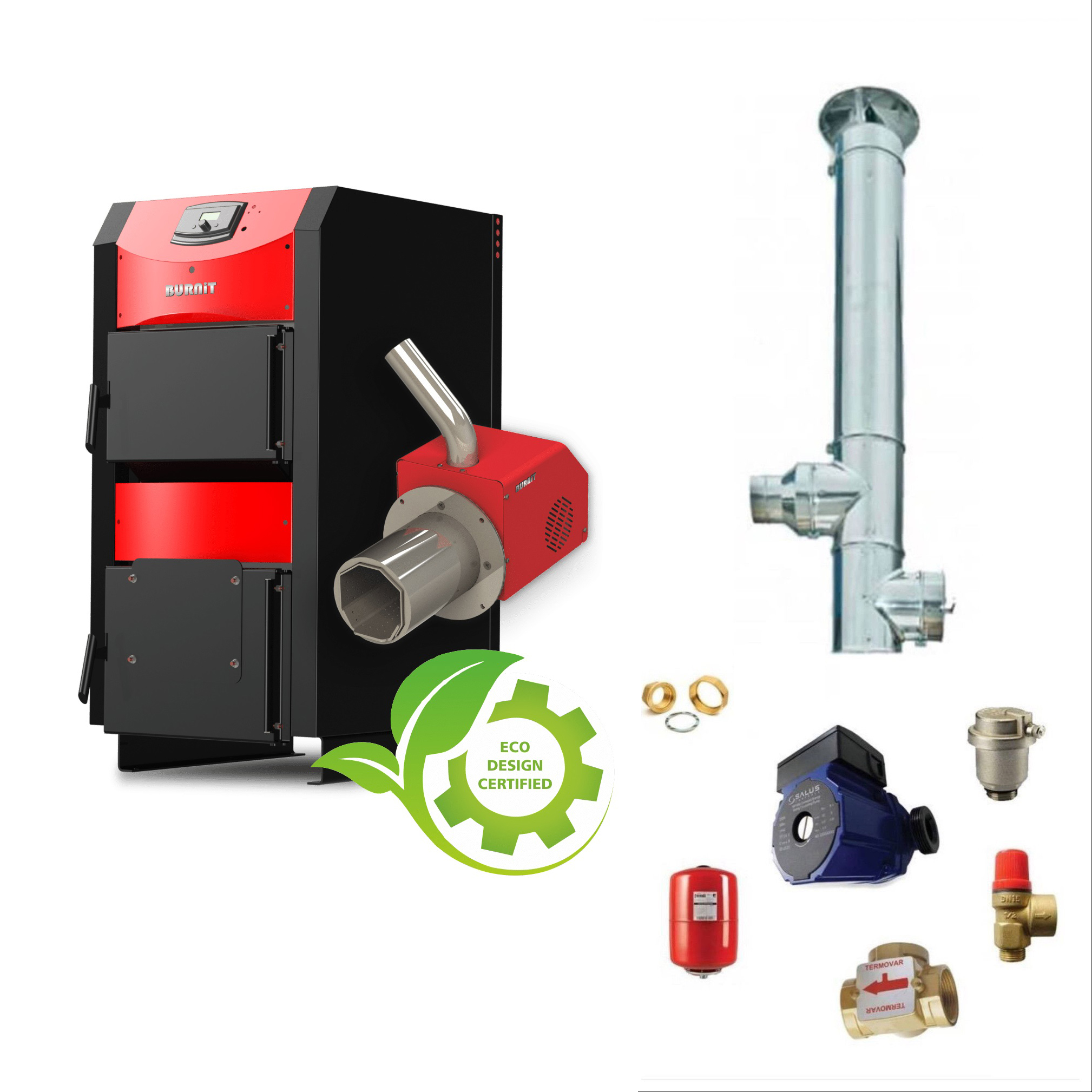 Pachet Centrala mixta combustibil solid si peleti Burnit NWB PRIME 40 kW si Arzator peleti Pell Eco 35 kW, ventilator, automatizare, flansa arzator, serpentina de racire, cos de fum 8 metri dn 200, pompa 25-60, vas expansiune 50 , supapa, aerisitor, vana 3 cai 1’Pachet incalzire format din:1. Centrala mixta combustibil solid si peleti Burnit NWB PRIME 40 kW si Arzator pe peleti Pell Eco 35 kW2. Cos de fum inox dublu perete dn 200 inaltime 8 metri complet pentru montaj, format din flansa de prindere la sol, teu de racordare, teu de curatare, tronson 1 metru – 7 buc, palarie, 3 coliere, reductie DP SP 2003. Pompa 25-604. Vas expansiune 50 litri5. Supapa siguranta 1/26. Aerisitor automat 1/27. Vana cu 3 cai 1” SET DE INCALZIRE CENTRALA NWB PRIME 40 kW CU ARZATOR PE PELETI PELL ECO 35 KWSet gata pentru folosire. Pentru arderea peletilor din lemn.Setul contine:CAZANUL PE COMBUSTIBIL SOLID BURNIT NWB PRIME 40 kWCazanul pe combustibil solid, 40 kW, cu ventilator, NWB PRIME 40, BURNiT este destinat pentru încălzirea încăperilor mari și medii, pentru sisteme de încălzire centrală în clădiri rezidențiale, comerciale sau industriale, unde necesarul de căldură nu depășește 40 kW. Este un cazan din tablă de oțel echipat cu o unitate de control, controler TECH inteligent, plus dotat cu un ventilator pentru creșterea performanței și pentru circulația forțată a aerului. Cazanul NWB PRIME 40, BURNiT a fost proiectat și format pentru a se adapta la arderea lemnului de foc, brichetelor din lemn și cărbunelui. Pe lângă acestea – ținând cont de cele mai moderne soluții, dacă adăugați un arzător de peleți ca accesoriu suplimentar, îl puteți folosi ca un cazan pe peleți.Testat si aprobat conform Norma Europeana EN-303-5.ARZATORUL PE PELETI PELLArzatoarele pe peleti BURNiT Pell sunt destinate arderii peletilor de lemn cu un diametru de 6-8 mm. Contribuie la un proces de ardere ecologic si de mare eficienta. Arzatoarele sunt confectionate din otel inoxidabil de calitate, care rezista la temperaturi de pana la 1150°С. Controlul cu microprocesor incorporate, sistemul de auto-curatare si snecul interior, garanteaza o exploatare usoara si ardere optima a combustibilului. Arzatorul pe peleti Pell este montat la cazan.AVANTAJE:Incalzirea camerelor medii si mariМontare si utilizare usoaraGratar metalic detasabilRegulator termostaticPosibilitatea instalarii unui arzator cu gaz, ulei sau peletiAVANTAJE: Comanda electronica controleaza arderea prin gestionarea functionarii ventilatorului; posibilitate de gestionare a doua pompe – pentru incalzire centrala si pentru apa calda menajera (ACM). Suflanta pentru alimentare cu aer a camerei de ardere; optimizeaza procesul de ardere si consumul de combustibil. Manta de apa inconjoara intreaga camera de ardere pentru a maximiza utilizarea caldurii reziduale. Camera de ardere are o suprafata mare de schimb de caldura si o rezistenta a camerei mica. Usa de incarcare de dimensiuni mari ceea ce usureaza introducerea lemnelor chiar si de mari dimensiuni (dimensiunea lemnelor pana la 50 cm). Suprafata cu nervuri a camerei de ardere si cele trei cai de eliminare a fumului, asigura un schimb de caldura cu randament ridicat. Gratarul metal detasabil protejeaza grila de conducte de flacara. Flansa pe usa inferioara pentru montarea unui arzator pe peleti, gaz sau motorina (optional).DISPOZITIVE DE SIGURANTA Termostat siguranta STB – opreste ventilatorul si opreste procesul de ardere. Supapa de siguranta la 3 bar. Serpentina de racire in caz de supraincalzire, prin aceasta trece apa rece, care reduce temperatura cazanului. Conectarea cazanului la reteaua de alimentare cu apa trebuie sa fie efectuata printr-un robinet termostatic (nu este inclus in set). Supapa de siguranta montata pe ventilator.ELEMENTELE CAZANULUI NWB PRIME 40 kW – PELL :1. Cazan NWB PRIME 40 kW2. Arzator pentru peleti Pell3. Buncar pentru peleti FH 500 /NEINCLUSE IN KIT – SE ACHIZITIONEAZA SEPARAT/4. Turbulatori5. Usa superioara pentru protectie6. Detasarea capacului flansei pe usa inferioaraa cazanului7. Kit de montaj – pentru conectarea arzatoruluiPell la cazan ELEMENTELE CAZANULUI NWB PRIME:1 – Control electronic2 – Capitonaj3 – Zolație de înaltă eficienta4 – Schimbător de căldură de siguranță5 – Trei drumuri de fum6 – Manta de apă7 – Camera de ardere8 – Grilaj metalic9 – Container de cenușă și funingine10 – Container de cenușă și funingine11 – Coş de fum12 – Suflantă13 – Supapă de admisie a aeruluiSPECIFICAȚII TEHNICE Cum sa conectati arzatorul la termostat: