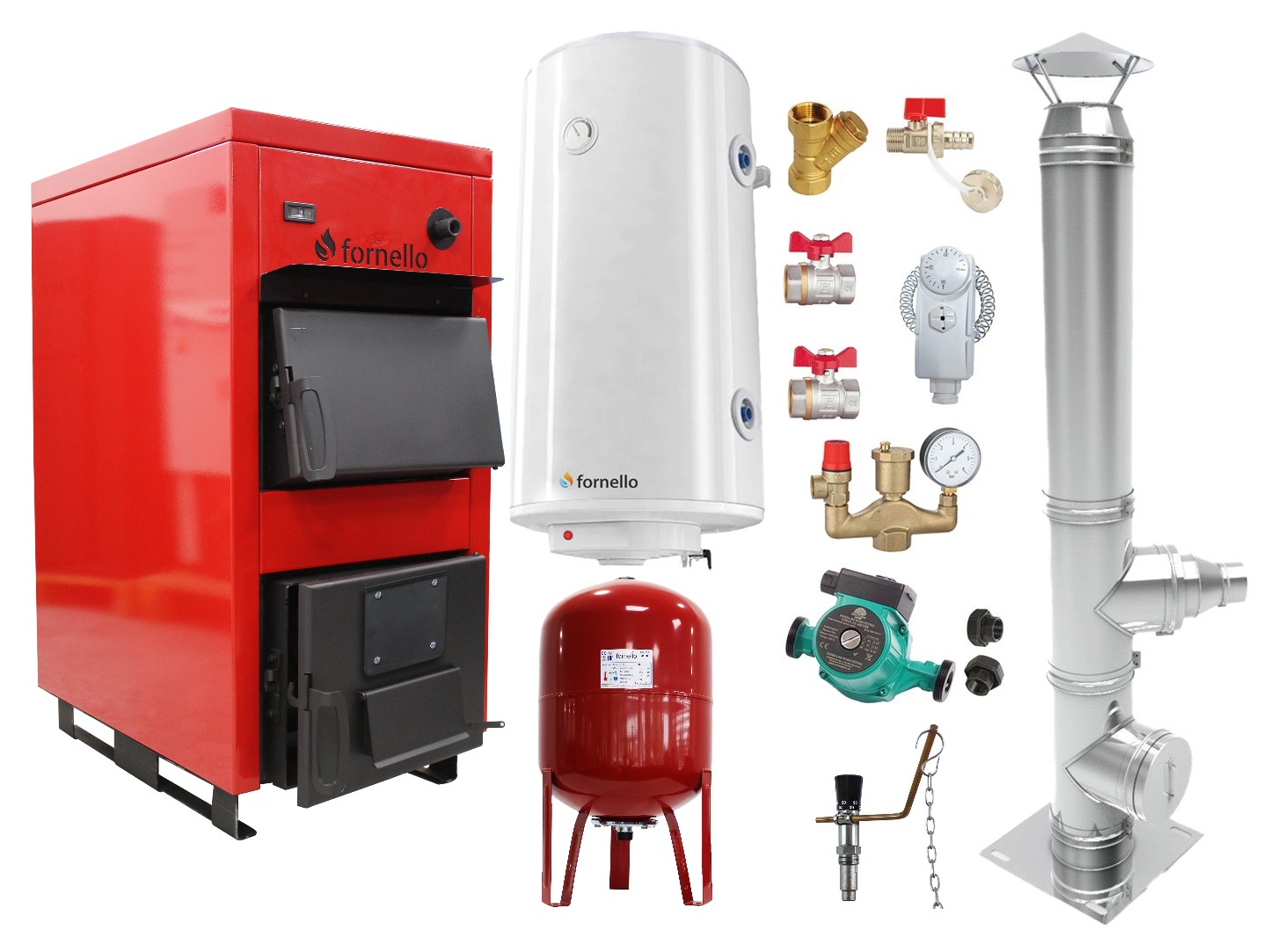 Pachet Centrala pe combustibil solid Fornello Eco Energy WB 35 kW, Cos Inox, Boiler Termoelectric, Vas Expansune, Pompa si Fitinguri MontajPachetul este compus din urmatoarele Componente:1. Cazan (centrala) pe combustibil solid, (lemn,carbune) Fornello Eco Energy WB 35 kW;2. Cos de fum 6 ml, diametru 200 mm dublu perete inox-inox, izolat cu vata bazaltica, format din: flansa sol, teu racordare, teu curatare, 5 tronsoane de 1 metru, palarie antipoaie, 2 coliere fatada, racord dublu perete-simplu perete;3. Boiler termoelectric cu o serpentina Fornello Optima GCVS 1004415 D09 TR 1S, 100 Litri, 1500 watt, reglaj extern al temperaturii, poliuretan expandat;4. Vas expansiune 80 litri;5. Pompa circulare 25-60 si olandezi;6. Kit fitiguri montaj de baza (acest set nu include toate fitingurile, sunt doar cele de baza principale, restul se vor achizitiona impreuna cu instalatorul sau firma care va efectua montajul) format din:- Grup de siguranta;- Termostat de contact – 1 buc;- Filtru Y 1″” – 1 buc;- Robinet trecere 1″” – 2 buc;- Robinet golire 1/2″” – 1 buc;- Regulator de tiraj cazan Regulus RT4;Centrala pe combustibil solid Fornello Eco Energy WB 35 kWCazanele Fornello Eco Energy sunt realizate din materiale certificate si de inalta calitate si beneficiaza de un design modern.Constructia cazanului este armonizata conform directivelor europene si standardelor europene.Cazanul a fost testat în conformitate cu standardele EN 303-5 si indeplineste toate conditiile de conectare la o instalatie de incalzire centrala.Cazanul este destinat incalzirii centrale a unitatilor rezidentiale mai mici, a caselor familiale, a firmelor, etc.Cazanul functioneaza pe combustibil solid.Temperatura de lucru a cazanului este de 60-90 °C.Camera de ardere si partea convectiva a cazanului Fornello Eco Energy sunt realizate din tabla din otel de inalta calitate folosind tehnologia de sudare.Cazanul este bine izolat cu vata minerala.Instalarea si punerea in funcțiune a cazanului sunt simple, iar conexiunile sunt standard.Avantajele folosirii unei centrale pe combustibil solid Fornello Eco Energy WB 35 kWFoloseste cele mai ieftine surse de incalzire, pretul inferior al combustibilului folosit care poate fi lemn sau carbune, este de pana la 2-3 ori mai mic decat pretul celorlalte surse de incalzit; Ramanane cea mai simpla si accesibila solutie atat pentru incalzirea locuintei, cat si pentru prepararea de apa calda menajera care se poate realiza prin intermediul unui boiler cu serpentina (termoelectric), fiind foarte utila in zonele unde nu exista retea de gaze naturale, putand inlocui cu succes clasicele sobe;Durata lunga de viata fara probleme, costuri de exploatare si intretinere reduse, fiind un cazan clasic fara automatizari, probabilitatea de a avea o avarie este foarte redusa;Centrala poate fi utilizata in spatii cu o suprafata peste medie, care poate ajunge chiar si la 200 de metri patrati;Este o centrala eficienta, cu un randament ridicat;Lemnul este ars integral, fumul rezultat fiind curat, fara impact asupra mediului;Intretinere facila, cu descarcarea cenusii de cateva ori pe luna;Elementele cazanului Fornello Eco Energy WB 35 kW1. Racord tur cazan2. Racord serpentina de racire3. Racord Coș de fum4. Orificiu de curățare a coșului de fum5. Racord retur cazan6. Racord alimentare si golire cazan7. Termometru8. Orificiu conectare regulator tiraj (nu vine la pachet cu cazanul, se va achizitiona separat)9. Usa alimentare cu combustibil10. Usa pentru curatare11. Usa pentru aer primarSpecificatii tehnice Cazan Fornello Eco energy WB 35 kWINFORMATII UTILEIn centrala nu trebuie facut focul înainte de conectarea la sistemul de Incalzire centrala.Inainte de a porni focul, verificati daca sistemul de incalzire centrala este corect aerisit.Pompa de circulare trebuie conectata la un termostat/controler, cu sonda montata pe conexiune de tur, cat mai aproape de cazan, care trebuie setat la minim 60 grade.MODEL SCHEMA DE MONTAJ CU ELEMENTELE NECESARE INSTALARII UNUI CAZAN COMBUSTIBIL SOLID FORNELLO ECO ENERGY WB 351. Termostat pompa2. Vas expansiune3. Robinet4. Vana amestec5. Supapa presiune6. Aerisitor automat7. Boiler termoelectric8. Pompa circulare9. Supapa sens10. Robinet cu sertar11. Filtru Y12. ManometruRegulatorul de tiraj, vana de descarcare termica (BVTS) si vana de amestec sunt obligatorii, dar nu se livreaza impreuna cu cazanul!Timpul de ardere al cazanului depinde de: Respectarea schiței de montaj, recomandată de producator; Cantitatea de combustibil; Proprietatile combustibilului (umiditate, esenta, puterea calorica); Temperatura exterioara; Suprafata si izolația locuintei; Temperatura dorita în locuinta;Imaginea de mai jos arata cum se instaleaza conducta de evacuare.Conducta de evacuare nu trebuie să aibă mai mult de 3 coturi si nu trebuie sa fie mai mare de 1,5 m. Conducta de evacuare trebuie sa fie la un unghi de cel putin 30 grade. Tevile de evacuare nu trebuie sa fie in pozitie orizontala. Un amortizor este instalat in camera de ardere a cazanului. Rolul amortizorului este de a impiedica cazanul sa sufle fum in usa atunci când deschide usa de ardere, adica sa directioneze gazele de ardere spre cosul de fum cu ajutorul amortizorului. Cand usa de ardere este inchisa, amortizorul revine la pozitia initiala, astfel incat gazele de ardere sa treaca prin schimbatorul cazanului si cazanul sa primeasca o utilizare cu un randament maxim.Gratarul pe care sunt asezate lemnele are rol si de recuperator de caldura, prin interiorul acestuia circuland agent termic.Pentru protectia hidraulica in sistemul inchis este necesara instalarea unei vane termice de siguranta cu 2 cai (nu este inclusa in furnitura standard). Daca din anumite motive temperatura apei din cazan depaseste 95°C, vana termica se deschide automat, astfel ca apa rece de la retea intra in cazan, prin serpentina de racire, pentru a reduce temperatura agentului termic din cazan.Focul din cazan se poate stinge fortat in caz de urgenta