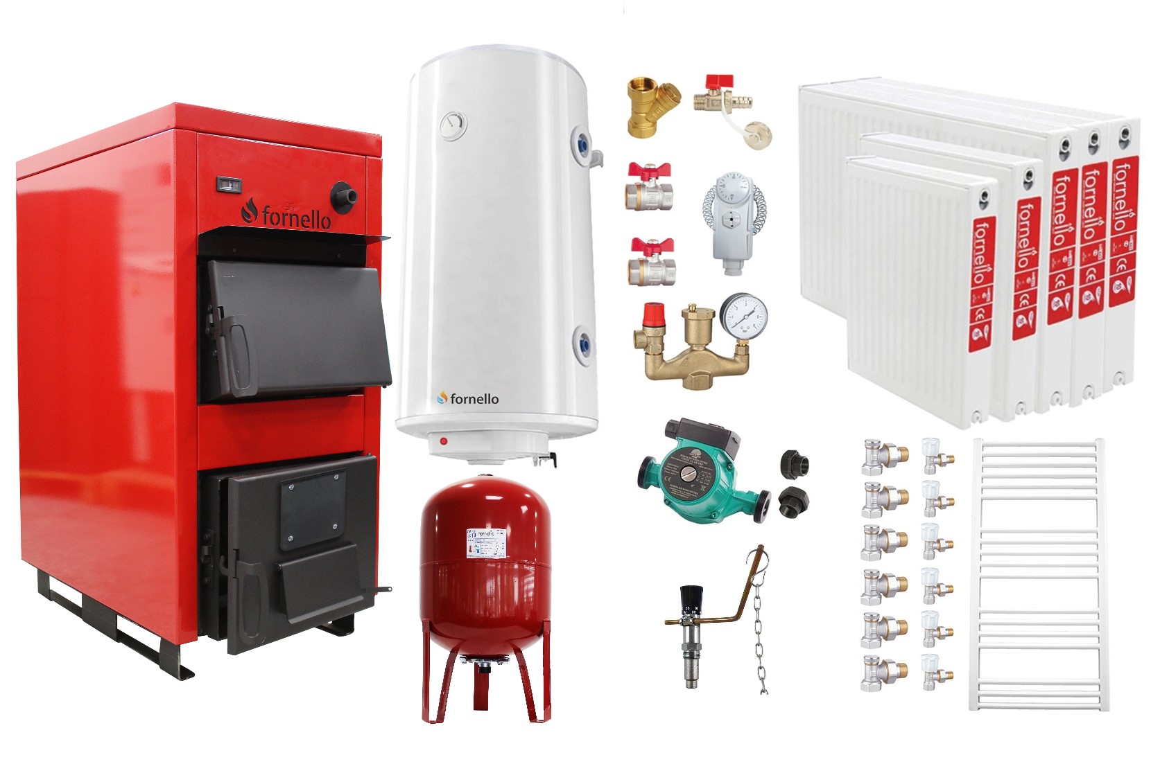 Pachet Centrala pe combustibil solid Fornello Eco Energy WB 35 kW, Radiatoare Otel, Boiler Termoelectric, Vas Expansune, Pompa si Fitinguri MontajPachetul este compus din urmatoarele Componente:1. Centrala pe combustibil solid Fornello Eco Energy WB 35 kW;2. Set Radiatoare (calorifere) din otel Fornello, radiator port prosop pentru baie si robineti tur/retur format din: Radiator (calorifer) otel Fornello 22, 600 x 1400 mm – 2 buc; Radiator (calorifer) otel Fornello 22, 600 x 1200 mm – 1 buc; Radiator (calorifer) otel Fornello 22, 600 x 1000 mm – 1 buc; Radiator (calorifer) otel Fornello 22, 600 x 800 mm – 1 buc; Radiator port prosop pentru baie 400 x 1000 mm – 1 buc; Robinet tur radiator (calorifer) – 6 buc; Robinet retur radiator (calorifer) – 6 buc;3. Boiler termoelectric cu o serpentina Fornello Optima GCVS 1004415 D09 TR 1S, 100 Litri, 1500 watt, reglaj extern al temperaturii, poliuretan expandat;4. Vas expansiune 80 litri;5. Pompa circulare 25-60 si olandezi;6. Kit fitiguri montaj de baza (acest set nu include toate fitingurile, sunt doar cele de baza principale, restul se vor achizitiona impreuna cu instalatorul sau firma care va efectua montajul) format din:- Grup de siguranta;- Termostat de contact – 1 buc;- Filtru Y 1″” – 1 buc;- Robinet trecere 1″” – 2 buc;- Robinet golire 1/2″” – 1 buc;- Regulator de tiraj cazan Regulus RT4;Centrala pe combustibil solid Fornello Eco Energy WB 35 kWCazanele Fornello Eco Energy sunt realizate din materiale certificate si de inalta calitate si beneficiaza de un design modern.Constructia cazanului este armonizata conform directivelor europene si standardelor europene.Cazanul a fost testat în conformitate cu standardele EN 303-5 si indeplineste toate conditiile de conectare la o instalatie de incalzire centrala.Cazanul este destinat incalzirii centrale a unitatilor rezidentiale mai mici, a caselor familiale, a firmelor, etc.Cazanul functioneaza pe combustibil solid.Temperatura de lucru a cazanului este de 60-90 °C.Camera de ardere si partea convectiva a cazanului Fornello Eco Energy sunt realizate din tabla din otel de inalta calitate folosind tehnologia de sudare.Cazanul este bine izolat cu vata minerala.Instalarea si punerea in funcțiune a cazanului sunt simple, iar conexiunile sunt standard.Avantajele folosirii unei centrale pe combustibil solid Fornello Eco Energy WB 35 kWFoloseste cele mai ieftine surse de incalzire, pretul inferior al combustibilului folosit care poate fi lemn sau carbune, este de pana la 2-3 ori mai mic decat pretul celorlalte surse de incalzit; Ramanane cea mai simpla si accesibila solutie atat pentru incalzirea locuintei, cat si pentru prepararea de apa calda menajera care se poate realiza prin intermediul unui boiler cu serpentina (termoelectric), fiind foarte utila in zonele unde nu exista retea de gaze naturale, putand inlocui cu succes clasicele sobe;Durata lunga de viata fara probleme, costuri de exploatare si intretinere reduse, fiind un cazan clasic fara automatizari, probabilitatea de a avea o avarie este foarte redusa;Centrala poate fi utilizata in spatii cu o suprafata peste medie, care poate ajunge chiar si la 200 de metri patrati;Este o centrala eficienta, cu un randament ridicat;Lemnul este ars integral, fumul rezultat fiind curat, fara impact asupra mediului;Intretinere facila, cu descarcarea cenusii de cateva ori pe luna;Elementele cazanului Fornello Eco Energy WB 35 kW1. Racord tur cazan2. Racord serpentina de racire3. Racord Coș de fum4. Orificiu de curățare a coșului de fum5. Racord retur cazan6. Racord alimentare si golire cazan7. Termometru8. Orificiu conectare regulator tiraj (nu vine la pachet cu cazanul, se va achizitiona separat)9. Usa alimentare cu combustibil10. Usa pentru curatare11. Usa pentru aer primarSpecificatii tehnice Cazan Fornello Eco energy WB 35 kWINFORMATII UTILEIn centrala nu trebuie facut focul înainte de conectarea la sistemul de Incalzire centrala.Inainte de a porni focul, verificati daca sistemul de incalzire centrala este corect aerisit.Pompa de circulare trebuie conectata la un termostat/controler, cu sonda montata pe conexiune de tur, cat mai aproape de cazan, care trebuie setat la minim 60 grade.MODEL SCHEMA DE MONTAJ CU ELEMENTELE NECESARE INSTALARII UNUI CAZAN COMBUSTIBIL SOLID FORNELLO ECO ENERGY WB 351. Termostat pompa2. Vas expansiune3. Robinet4. Vana amestec5. Supapa presiune6. Aerisitor automat7. Boiler termoelectric8. Pompa circulare9. Supapa sens10. Robinet cu sertar11. Filtru Y12. ManometruRegulatorul de tiraj, vana de descarcare termica (BVTS) si vana de amestec sunt obligatorii, dar nu se livreaza impreuna cu cazanul!Timpul de ardere al cazanului depinde de: Respectarea schiței de montaj, recomandată de producator; Cantitatea de combustibil; Proprietatile combustibilului (umiditate, esenta, puterea calorica); Temperatura exterioara; Suprafata si izolația locuintei; Temperatura dorita în locuinta;Imaginea de mai jos arata cum se instaleaza conducta de evacuare.Conducta de evacuare nu trebuie să aibă mai mult de 3 coturi si nu trebuie sa fie mai mare de 1,5 m. Conducta de evacuare trebuie sa fie la un unghi de cel putin 30 grade. Tevile de evacuare nu trebuie sa fie in pozitie orizontala. Un amortizor este instalat in camera de ardere a cazanului. Rolul amortizorului este de a impiedica cazanul sa sufle fum in usa atunci când deschide usa de ardere, adica sa directioneze gazele de ardere spre cosul de fum cu ajutorul amortizorului. Cand usa de ardere este inchisa, amortizorul revine la pozitia initiala, astfel incat gazele de ardere sa treaca prin schimbatorul cazanului si cazanul sa primeasca o utilizare cu un randament maxim.Gratarul pe care sunt asezate lemnele are rol si de recuperator de caldura, prin interiorul acestuia circuland agent termic.Pentru protectia hidraulica in sistemul inchis este necesara instalarea unei vane termice de siguranta cu 2 cai (nu este inclusa in furnitura standard). Daca din anumite mo