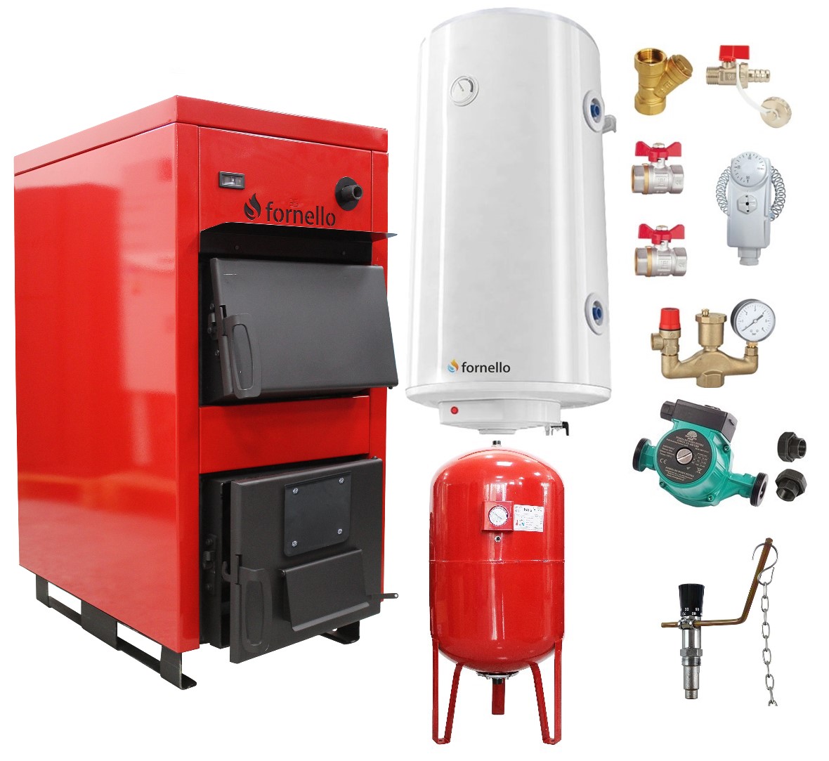 Pachet Centrala pe combustibil solid Fornello Eco Energy WB 50 kW, Boiler Termoelectric, Vas Expansune, Pompa si Fitinguri MontajPachetul este compus din urmatoarele Componente:1. Centrala pe combustibil solid Fornello Eco Energy WB 50 kW;2. Boiler termoelectric cu o serpentina Fornello Optima GCVS 1004415 D09 TR 1S, 100 Litri, 1500 watt, reglaj extern al temperaturii, poliuretan expandat;3. Vas expansiune 100 litri;4. Pompa circulare 32-60 si olandezi;5. Kit fitiguri montaj de baza (acest set nu include toate fitingurile, sunt doar cele de baza principale, restul se vor achizitiona impreuna cu instalatorul sau firma care va efectua montajul) format din:- Grup de siguranta;- Termostat de contact – 1 buc;- Filtru Y 1″” – 1 buc;- Robinet trecere 1″” – 2 buc;- Robinet golire 1/2″” – 1 buc;- Regulator de tiraj cazan Regulus RT4;Centrala pe combustibil solid Fornello Eco Energy WB 50 kWCazanele Fornello Eco Energy sunt realizate din materiale certificate si de inalta calitate si beneficiaza de un design modern.Constructia cazanului este armonizata conform directivelor europene si standardelor europene.Cazanul a fost testat în conformitate cu standardele EN 303-5 si indeplineste toate conditiile de conectare la o instalatie de incalzire centrala.Cazanul este destinat incalzirii centrale a unitatilor rezidentiale mai mici, a caselor familiale, a firmelor, etc.Cazanul functioneaza pe combustibil solid.Temperatura de lucru a cazanului este de 60-90 °C.Camera de ardere si partea convectiva a cazanului Fornello Eco Energy sunt realizate din tabla din otel de inalta calitate folosind tehnologia de sudare.Cazanul este bine izolat cu vata minerala.Instalarea si punerea in funcțiune a cazanului sunt simple, iar conexiunile sunt standard.Avantajele folosirii unei centrale pe combustibil solid Fornello Eco Energy WB 50 kWFoloseste cele mai ieftine surse de incalzire, pretul inferior al combustibilului folosit care poate fi lemn sau carbune, este de pana la 2-3 ori mai mic decat pretul celorlalte surse de incalzit; Ramanane cea mai simpla si accesibila solutie atat pentru incalzirea locuintei, cat si pentru prepararea de apa calda menajera care se poate realiza prin intermediul unui boiler cu serpentina (termoelectric), fiind foarte utila in zonele unde nu exista retea de gaze naturale, putand inlocui cu succes clasicele sobe;Durata lunga de viata fara probleme, costuri de exploatare si intretinere reduse, fiind un cazan clasic fara automatizari, probabilitatea de a avea o avarie este foarte redusa;Centrala poate fi utilizata in spatii cu o suprafata peste medie, care poate ajunge chiar si la 300 de metri patrati;Este o centrala eficienta, cu un randament ridicat;Lemnul este ars integral, fumul rezultat fiind curat, fara impact asupra mediului;Intretinere facila, cu descarcarea cenusii de cateva ori pe luna;Elementele cazanului Fornello Eco Energy WB 50 kW1. Racord tur cazan2. Racord serpentina de racire3. Racord Coș de fum4. Orificiu de curățare a coșului de fum5. Racord retur cazan6. Racord alimentare si golire cazan7. Termometru8. Orificiu conectare regulator tiraj (nu vine la pachet cu cazanul, se va achizitiona separat)9. Usa alimentare cu combustibil10. Usa pentru curatare11. Usa pentru aer primarSpecificatii tehnice Cazan Fornello Eco energy WB 50 kWINFORMATII UTILEIn centrala nu trebuie facut focul înainte de conectarea la sistemul de Incalzire centrala.Inainte de a porni focul, verificati daca sistemul de incalzire centrala este corect aerisit.Pompa de circulare trebuie conectata la un termostat/controler, cu sonda montata pe conexiune de tur, cat mai aproape de cazan, care trebuie setat la minim 60 grade.MODEL SCHEMA DE MONTAJ CU ELEMENTELE NECESARE INSTALARII UNUI CAZAN COMBUSTIBIL SOLID FORNELLO ECO ENERGY WB 501. Termostat pompa2. Vas expansiune3. Robinet4. Vana amestec5. Supapa presiune6. Aerisitor automat7. Boiler termoelectric8. Pompa circulare9. Supapa sens10. Robinet cu sertar11. Filtru Y12. ManometruRegulatorul de tiraj, vana de descarcare termica (BVTS) si vana de amestec sunt obligatorii, dar nu se livreaza impreuna cu cazanul!Timpul de ardere al cazanului depinde de: Respectarea schiței de montaj, recomandată de producator; Cantitatea de combustibil; Proprietatile combustibilului (umiditate, esenta, puterea calorica); Temperatura exterioara; Suprafata si izolația locuintei; Temperatura dorita în locuinta;Imaginea de mai jos arata cum se instaleaza conducta de evacuare.Conducta de evacuare nu trebuie să aibă mai mult de 3 coturi si nu trebuie sa fie mai mare de 1,5 m. Conducta de evacuare trebuie sa fie la un unghi de cel putin 30 grade. Tevile de evacuare nu trebuie sa fie in pozitie orizontala. Un amortizor este instalat in camera de ardere a cazanului. Rolul amortizorului este de a impiedica cazanul sa sufle fum in usa atunci când deschide usa de ardere, adica sa directioneze gazele de ardere spre cosul de fum cu ajutorul amortizorului. Cand usa de ardere este inchisa, amortizorul revine la pozitia initiala, astfel incat gazele de ardere sa treaca prin schimbatorul cazanului si cazanul sa primeasca o utilizare cu un randament maxim.Gratarul pe care sunt asezate lemnele are rol si de recuperator de caldura, prin interiorul acestuia circuland agent termic.Pentru protectia hidraulica in sistemul inchis este necesara instalarea unei vane termice de siguranta cu 2 cai (nu este inclusa in furnitura standard). Daca din anumite motive temperatura apei din cazan depaseste 95°C, vana termica se deschide automat, astfel ca apa rece de la retea intra in cazan, prin serpentina de racire, pentru a reduce temperatura agentului termic din cazan.Focul din cazan se poate stinge fortat in caz de urgenta doar cu nisip, sau extinctor, nu se foloseste apa.