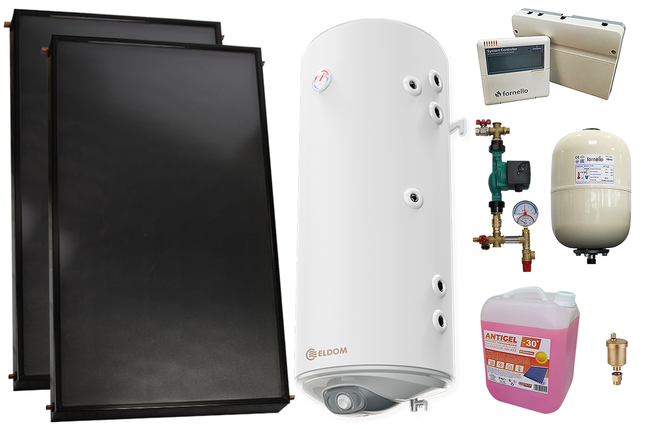 Pachet sistem solar presurizat, 2 x Panou solar plan Fornello 2.0 m² SPFP, Boiler cu 2 serpentine si rezistenta electrica Eldom WV15046S21R 150 l, grup pompare, controller, vas expansiune, antigel, aerisitorSistemul solar include:1. 2 x Panou solar plan Fornello 2.0 m² SPFP2. Automatizare solara -Automatizarea solara are rolul de a comanda pompa solara din grupul de pompare-Dotata cu 3 senzori de temperatura (temperatura de la colectorul solar, temperatura din partea de sus a boilerului, respectiv din partea de jos a boilerului)-Microprocesor pentru monitorizarea si controlul colectorului solar, boilerului si pompei de recirculatie.-Display LCD care indica starea de functionare a instalatiei solare-Functii suplimentare: controlul diferentelor de temperatura; temperatura limita, maxima si minima a colectorului solar; temperatura anti-inghet; temperatura maxima de stocare apa calda menajera; racire; functie anti-legionella; functie by-pass; functie de recirculare; mod vacanta (racire);mod manual3. Boiler mixt cu 2 serpentine in paralel Eldom GREEN LINE WV15046S21R 150 L, 3 Kw4. Grup pompare format din urmatoarele componente:Robinet alama ½” Fi-Fe – 1 buc;Cruce alama ½” – 2 buc;Niplu alama ½” – 6 buc;Reductie alama 1” – ½” – 2 buc;Pompa circulare – 1 buc;Olandezi pompa – 2 buc;Supapa sens alama ½” – 1 buc;Robinet golire alama ½” – 1 buc;Prelungitor ½” 40 mm Fi-Fe – 1 buc;Teu alama ½” – 1 buc;Termomanometru ½” vertical – 1 buc;Supapa siguranta 6 bar – 1 buc;5. Vas de expansiune solar 24 litri-Presiune maxima de lucru: 10 bar-Presiune aer preincarcata: 2,5 bar-Racord 3/4”6. Aerisitor automat-Racord 1/2″”7. Antigel solar preparat 10 kg-Antigel solar pentru instalatii solare propilen glicol aditivat-Temperatura de lucru: -28°C / 180°CPanou solar plan Fornello 2.0 m² SPFP Un panou plan este un schimbator de caldura care transforma energia solara radianta de la soare in energie termica folosind binecunoscutul efect de sera. Colecteaza sau capteaza energia solara și o folosește pentru a incalzi apa din casa pentru baie, spalat si incalzire, poate fi folosit chiar și pentru a incalzi piscinele in aer liber si cazile cu hidromasaj.Pentru majoritatea aplicatiilor de apa calda rezidentiale și comerciale mici, panourile solare plane tind sa fie mai rentabile datorita designului lor simplu, costului redus si instalarii relativ mai usoare in comparatie cu alte forme de sisteme de incalzire cu apa calda. De asemenea, panourile solare plane sunt mai mult decat capabile sa furnizeze cantitatea necesara de apa calda la temperatura necesara.Caracteristici:-Panourile solare nu necesita montarea boilerului pe acoperis, boilerul poate fi pozitionat oriunde in locuinta, rezultand o pierdere minima de caldura pe timp racoros-Panoul solar a fost optimizat pentru a furniza apa calda menajera tot timpul anului, se poate folosi un boiler bivalent cu 2 serpentine.-O serpentina se monteaza la panoul solar, cea de a doua serpentina se monteaza fie pentru aport la incalzire, fie la o alta sursa aditionala pentru a incalzi apa menajera din boiler-Poate fi montat pe orice tip de acoperis si pe orice suprafata plana-Circuitul de schimb termic (intre panou si boiler) contine agent termic pe baza de antigel, astfel ca poate fi folosit si pe timp de iarna-Instalatiile de panouri solare plane de inalta eficienta sunt un mod ecologic si eficient de producere a apei calde menajere in sezonul cald al anului. Colectorul absoarbe eficient razele solare, care cade pe suprafata lui sşi transmite energia catre agentul termic.Panou solar plan Fornello 2.0 m² SPFPPanourile solare plane Fornello sunt panouri solare termice ce capteaza energia solara continuta in razele solare si o transforma in energie termica.Schimbatorul de caldura fabricat in intregime din cupru de calitate superioara, are o rezistenta hidraulica scazuta si este acoperit cu straturi absorbante solare care asigura un randament foarte bun de utilizare a energiei solare. Stratul solar absorbant pentru este un lac special de culoare neagra.Carcasa colectorului solar este fabricat din profil special de aluminiu, iar partea de jos a unitatii este inchisa cu placa de aluminiu. Izolatia este realizata din vata minerala cu caldura ridicata, performanta izolatiei, ceea ce reduce pierderile termice intr-o masura considerabila.Cea mai importanta componenta a colectorului solar este absorbantul de raze solare. Este fabricat din elemente de cupru de inalta calitate. Modelul colector sunt acoperite cu negru special acoperire care este capabila sa reziste la temperaturi ridicate. Carcasa colectorului solar este acoperita cu sticla termica prismatica speciala si etansare cu siliciu capabil sa reziste la temperaturi ridicate. Toate acestea garanteaza o fiabilitate ridicata a colectoarelor noastre solare.AVANTAJEFoloseste energia solara pentru obtinerea apei calde menajere si aport de calduraAbsorbant in totalitateRata de absortie a caldurii 95±2%, panourile fornello ofera o eficienta foarte ridicataMontaj pe Acoperis inclinat / Acoperiș plat, cu un unghi de inclinare intre 30 – 90º (Min-Max).Absorbant cu acoperire selectivaLegarea: teava de cupru ø22 fara filet si elemente de conectareSticla solara de siguranta, Calita termic. Foarte rezistent la vant, zapada si grindina.Viziune eleganta, Panourile solare plane Fornello au greutate redusa sunt usor de montat si ofera un aspect placut locuitei taleAVANTAJE: Absorbant in totalitate. Stratul selectiv de inalta tehnologie a ofera o eficienta ridicata si durabilitate. Tehnologia de sudare cu laser de la Bluetec prin punct dublu pas 3 mm, ofera o durabilitate foarte mare in timp. Harpa tubulara cu rezistența hidraulica scazuta. Testata pentru scurgeri. Cadru din aluminiu-magneziu rezistent la condițiile meteo, cu posibilitate de montare in diferite pozitii. Sticla solara de siguranta, Calita termic. Foarte rezistent la vant, zapada si grindina. Garnitura siliconica