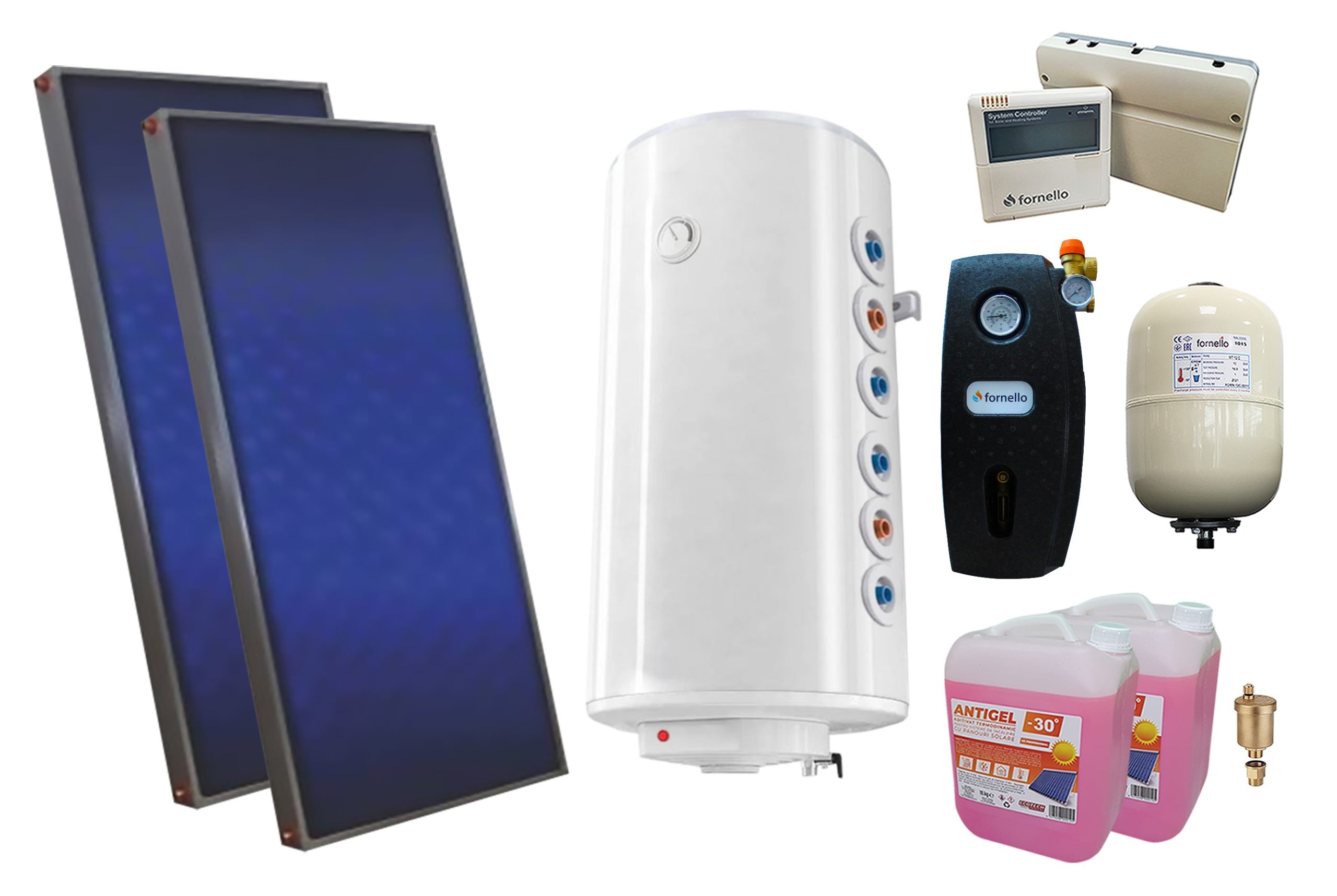 Pachet sistem solar presurizat, 2 x panou Sunsystem PК SL FP 2.0, Boiler 2 serpentine 150 litri, controller, vas expansiune, grup pompare, aerisitor 1/2, antigel Caracteristici:-Panourile solare nu necesita montarea boilerului pe acoperis, boilerul poate fi pozitionat oriunde in locuinta, rezultand o pierdere minima de caldura pe timp racoros-Panoul solar cu boiler bivalent a fost optimizat pentru a furniza apa calda menajera tot timpul anului-O serpentina se monteaza la panoul solar, cea de a doua serpentina se monteaza fie pentru aport la incalzire, fie la o alta sursa aditionala pentru a incalzi apa menajera din boiler-Poate fi montat pe orice tip de acoperis si pe orice suprafata plana-Circuitul de schimb termic (intre panou si boiler) contine agent termic pe baza de antigel, astfel ca poate fi folosit si pe timp de iarna-Instalatiile de panouri solare plane de inaltă eficienţă sunt un mod ecologic și eficient de producere a apei calde menajere in sezonul cald al anului. Colectorul absoarbă eficient razele solare, care cade pe suprafaţa lui şi transmite energia către agentul termic.Sistemul solar include:1. 2 x Panou solar plan Sunsystem PК SL FP 2.02. Automatizare solara -Automatizarea solara are rolul de a comanda pompa solara din grupul de pompare-Dotata cu 3 senzori de temperatura (temperatura de la colectorul solar, temperatura din partea de sus a boilerului, respectiv din partea de jos a boilerului)-Microprocesor pentru monitorizarea si controlul colectorului solar, boilerului si pompei de recirculatie.-Display LCD care indica starea de functionare a instalatiei solare-Functii suplimentare: controlul diferentelor de temperatura; temperatura limita, maxima si minima a colectorului solar; temperatura anti-inghet; temperatura maxima de stocare apa calda menajera; racire; functie anti-legionella; functie by-pass; functie de recirculare; mod vacanta (racire);mod manual3. Boiler termoelectric cu 2 serpentine Fornello Optima GCV7/4S 1504420 D09 TRP2 2S,150 Litri, 2000 watt, reglaj extern al temperaturii, poliuretan expandatCaracteristici tehnice boiler electric OPTIMA GCV7/4S 1504420 D09 TRP2 2STip montaj: vertical, pe pereteVolum net 137 L2 serpentineClasa energetica CControl MecanicIndicator luminos de functionareTermostat reglabilTensiunea de alimentare: 230V/50HzPutere nominala: 2000 WPresiunea de functionare a vasului: 0.8 MPaPresiunea de functionare a serpentinei: 0.6 MPaRacordurile hidraulice ale serpentine – Intrare/Iesire: 3/4″”Timp necesar pentru incalzire Δt 45K 15 °C: 0.42 minTimp necesar pentru incalzire Δt 45K 60 °C: 0.54 minSuprafata de schimb termic a serpentinei S1 [m2]: 0.5 m²Suprafata de schimb termic a serpentinei S2 [m2]: 0.3 m²Capacitatea serpentinei S1 [ l ] : 2.4 litriCapacitatea serpentinei S2 [ l ] : 1.4 litriPuterea maxima a serpentinei S1 in mod continuu *60-80°C: 13.4 kWPuterea maxima a serpentinei S2 in mod continuu *60-80°C: 8.1 kWDebit continuu de ACM la ΔT35°C (S1) *60-80°C: 330 l/hDebit continuu de ACM la ΔT35°C (S2) *60-80°C: 201 l/h4. Grup pompare Fornello5. Vas expansiune 24 litri6. Antigel solar preparat 20 kg-Antigel solar pentru instalatii solare propilen glicol aditivat-Temperatura de lucru: -28°C / 180°C7. Aerisitor automatATENTIE: Panoul Solar nu include suportul de prindere pe acoperis, acesta se poate achizitiona separat.Panouri solare plane SUNSYSTEM PK SELECT FPO linie noua de panouri solare colectoare SUNSYSTEM PK Select FP, cu absorbant din aluminiu si acoperire selectiva. Panourile solare plane de inaltă eficienţă sunt un mod ecologic și eficient de producere a apei calde menajere in sezonul cald al anului. Colectorul absoarbă eficient razele solare, care cade pe suprafaţa lui şi transmite energia către agentul termic.AVANTAJEAbsorbant in totalitateAcoperiș inclinat / Acoperiș platAbsorbant cu acoperire selectivaLegarea: teava de cupru ø22 fara filet si elemente de conexareSticlă solară de protecţieAVANTAJE: Absorbant in totalitate. Stratul selectiv de inaltă tehnologie a oferă o eficiență ridicată și durabilitate. Tehnologia de sudare cu ultrasunete oferă o sudare solidă, rezistentă la deformări mecanice şi termice. Harpă tubulară cu rezistență hidraulică scăzută. Testată pentru scurgeri. Cadru din aluminiu rezistent la condițiile meteo, cu posibilitate de montare in diferite poziţii. Sticlă solară de siguranță: Structură prismatică. Conținut scăzut de fier (FeO ≤0.02 %). Călită termic. Foarte rezistent la vant, zăpadă si grindină. Garnitură siliconică rezistentă la raze UV. Certificat: EN 12975:2006-06; CEN – 9949/2/2 DQS HELLAS.ELEMENTE:1 – Cadru de aluminiu2 – Garnitură siliconică3 – Sticlă solară de protecţie4 – Absorbant in totalitate cu acoperire selectiva5 – Izolaţie de inaltă eficienţă6 – Partea de jos a colectorului7 – Harpa din tevi de cupru8 – Conexiune Intrare / Ieşire9 – Legarea la 2 x PK Select FP – Adaptor pentru teava de cupru ø22Dimensiuni disponibile, M²: Modele verticale: 2.0 / 2.4SPECIFICATII TEHNICEDiagramăPierdere de presiune panouri solare PK Select FPa) – Pierdere de presiune (Ра)b) – Debit (kg/s)